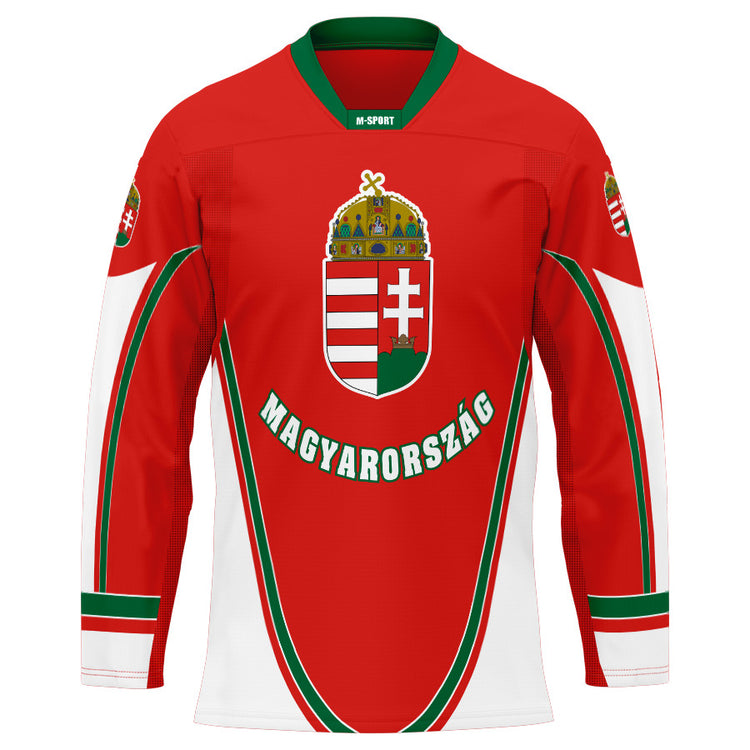 Transzfernyomot Magyarország szurkolói hokimez, Anyaga 100% Poliészter. Hatalmas Magyar címerrel és HUNGARY felirattal ellátva. Szublimációs transzfernyomással készült hosszú ujjú mez Anyaga: 100% PE interlock "active fit" Biztonsági varratok